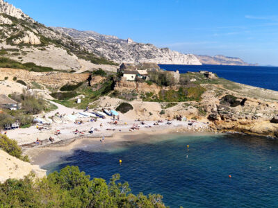 L’Anse des Croisettes est une plage de sable “au bout du monde”. Située aux Goudes au niveau du Cap Croisette face à l’île Maïre, il faut crapahuter sur un mince sentier, sur une crête rocheuse, pour l’atteindre et apprécier son spectaculaire panorama. Cette petite plage de sable est protégée de la pleine mer par une digue sommaire