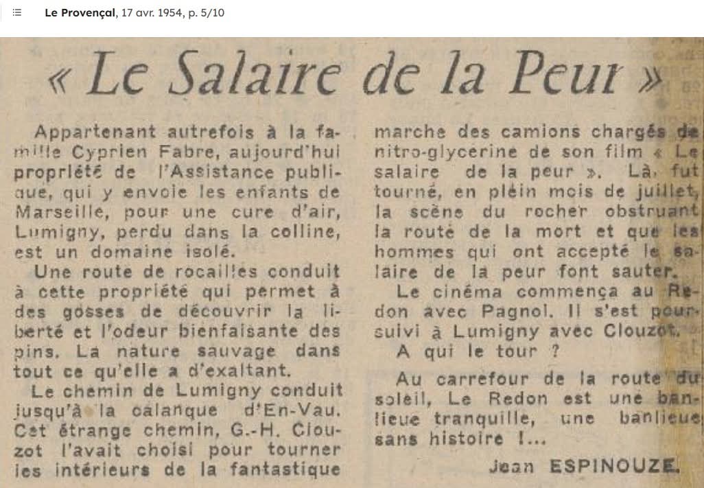 Le Salaire de la peur est un film franco-italien d’Henri-Georges Clouzot, sorti en 1953. Cette adaptation multi récompensée est tirée du roman du même nom signé Georges Arnaud en 1949. Avec, dans les rôles principaux, les acteurs Yves Montand, Charles Vanel, Folco Lulli et Peter van Eyck, le film raconte l’aventure périlleuse de quatre chauffeurs de camion devant convoyer un chargement dangereux et hautement instable de nitroglycérine afin d’éteindre l’incendie d’un puits de pétrole. Même si l’action est censée se dérouler dans un village imaginaire d’Amérique centrale, le film a été tourné dans le Gard, en Camargue et à Marseille durant le mois de juillet en partie sur le Chemin de Luminy conduisant à la Calanque d’En Vau pour la fameuse “marche des camions”.