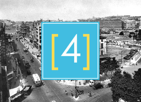 La photographie dans laquelle nous nous promenons aujourd’hui est une carte postale des années 50, une vue plongeante prise du dernier étage d’un immeuble de la Canebière au niveau des Cours Belsunce et Saint-Louis. A l’angle ainsi mis en scène se trouve le bar “américain”. C’est aussi la dernière maison héritière de la Vielle Ville avec ses colonnes engagées sur 3 étages. Cet angle est une ruine il va être rasé.
