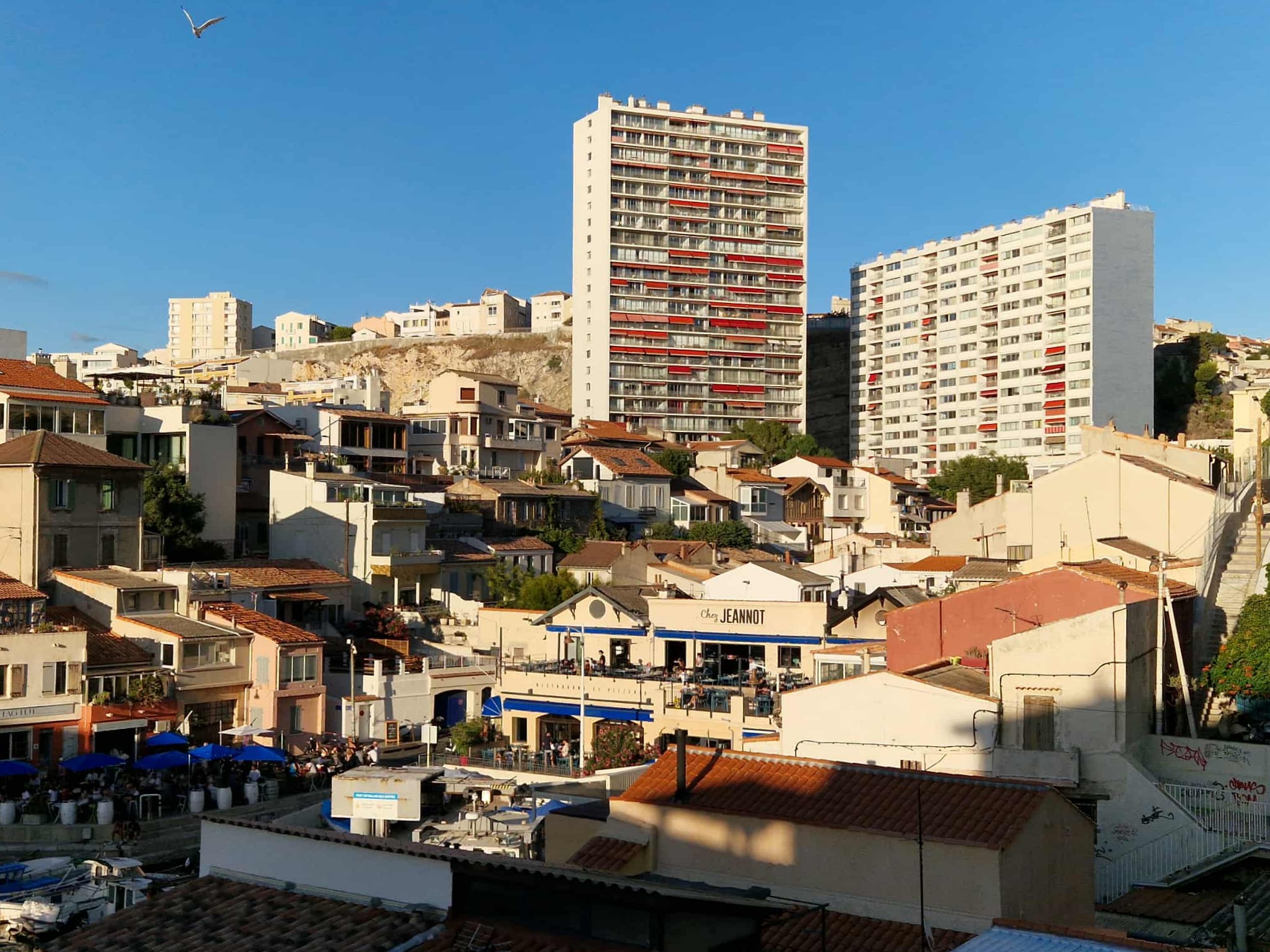 Ces barres massives, dominant le Vieux-Port sont un des symboles de la reconstruction du quartier d’après guerre. Cet ensemble construit entre 1946 et 1953 est signé des célèbres architectes René Egger et Fernand Pouillon, appuyé par les sculptures du céramiste aixois Jean Amado. Selon la Maison de l’Architecture et de la ville, cet ensemble est la