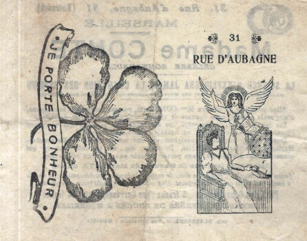 Le 38 rue d’Aubagne accueille depuis longtemps des salons de coiffure, mais à la fin du 19ème siècle, début 20ème se trouvait ici le costumier Barabino primé lors de l’Exposition coloniale de Marseille de 1906. On découvre son existence via l’édition de nombreuses cartes postales “patriotiques” imaginées par la maison de création lors de la