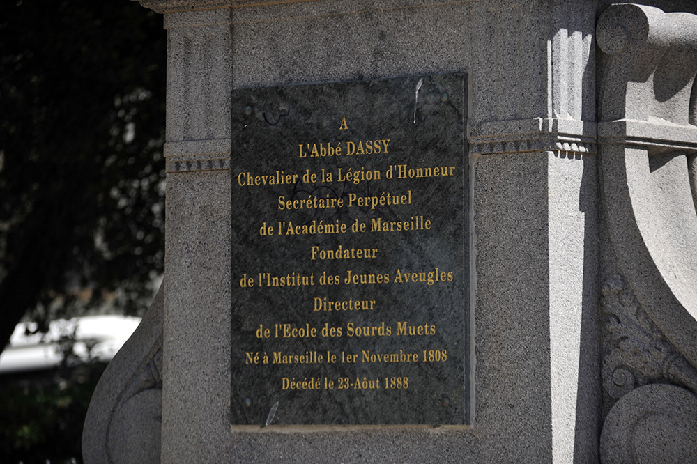 Cette statue en marbre de 1892 signée du sculpteur et peintre toulousain Alexandre Falguière, rend hommage à Louis Toussaint Dassy né à Marseille le 1er novembre 1808 et mort à Cauterets le 23 août 1888, abbé, historien et fondateur de l’Institut des jeunes aveugles et sourds-muets de Marseille. Cette sculpture représente l’abbé Dassy posant une main sur l’épaule d’un petit garçon et tenant de l’autre un livre, tandis qu’à ses pieds une fillette aveugle est assise, un ouvrage ouvert sur les genoux.